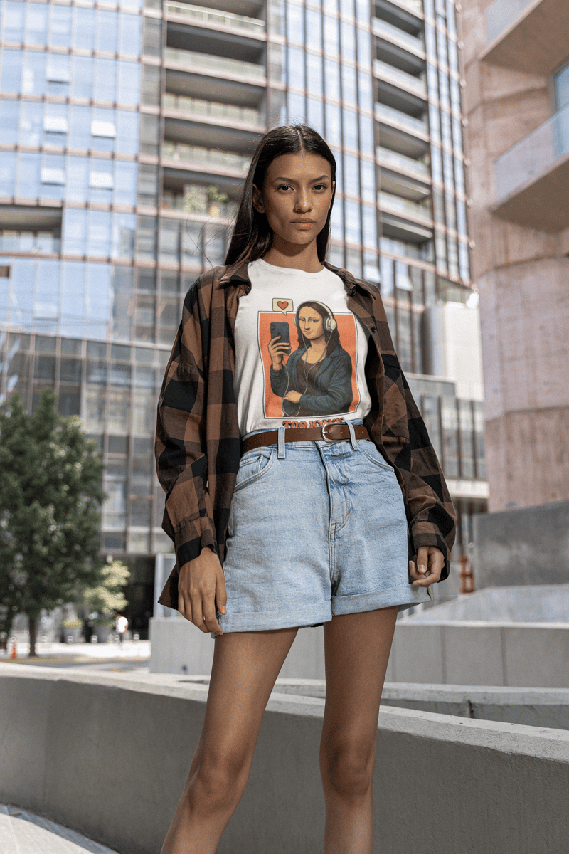 A estrela dessa peça? Uma estampa irreverente que traz a Monalisa como você nunca viu: segurando um smartphone e usando fones de ouvido, provando que o icônico nunca sai de moda. Afinal, quem disse que um ícone pertence a apenas uma era?