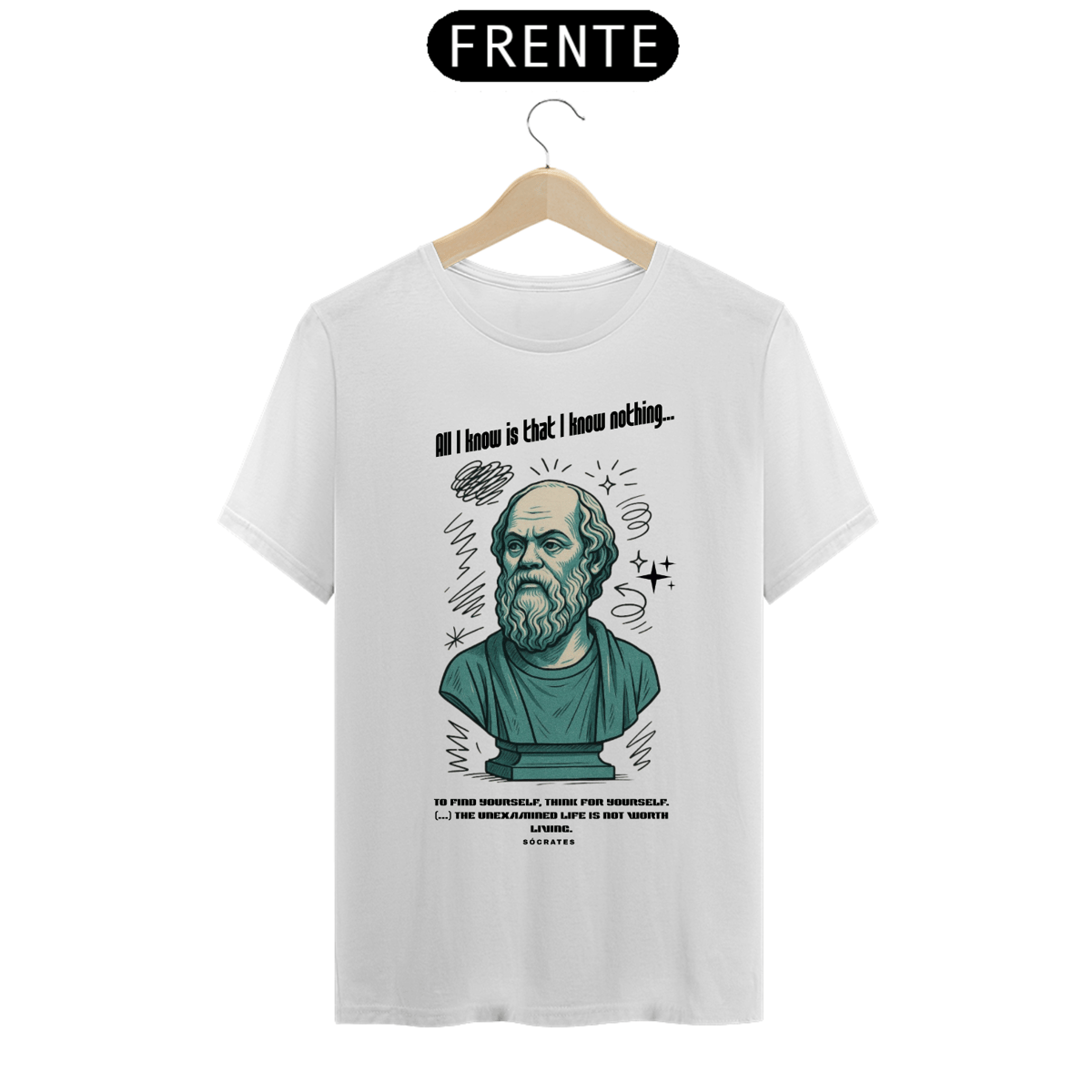 Apresente-se ao mundo com uma camiseta que conecta a sabedoria do passado ao dinamismo do presente. Inspirada no busto do filósofo Sócrates, esta peça une frases icônicas do pensador com elementos de arte moderna, criando um visual único que conversa com quem aprecia reflexões profundas e autenticidade fashion.
